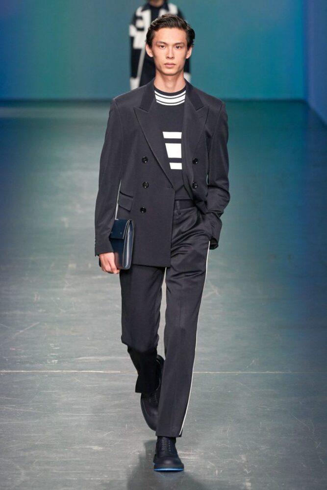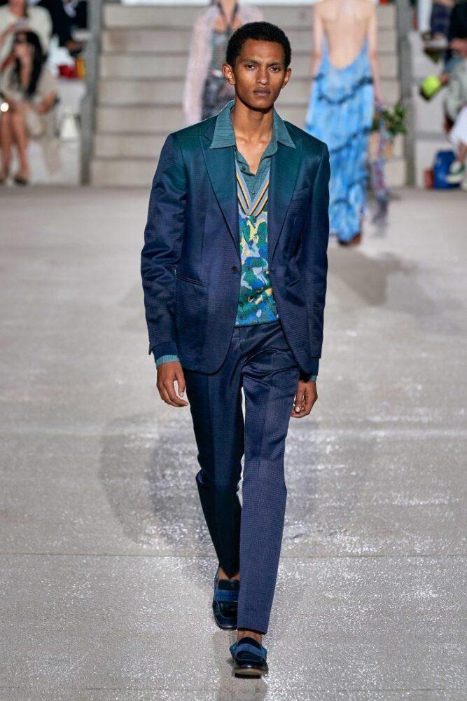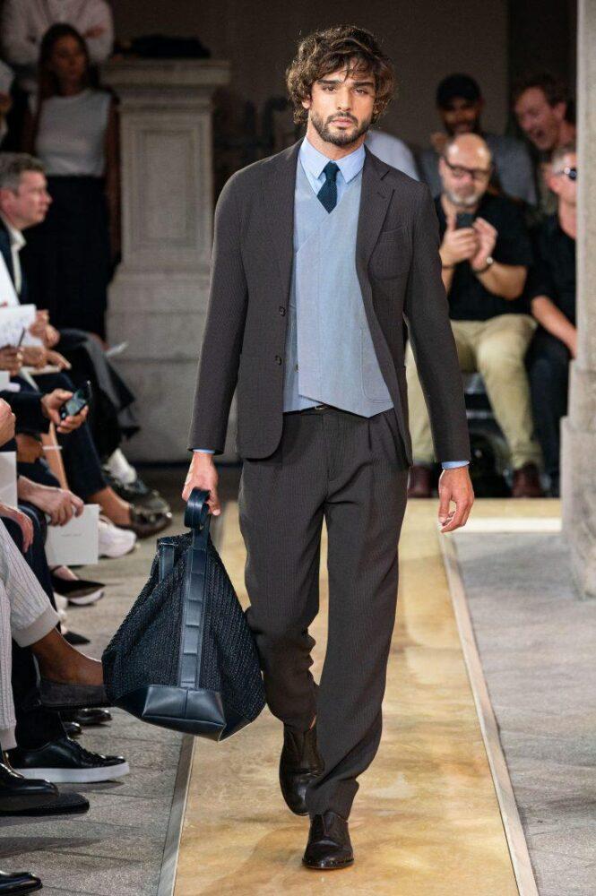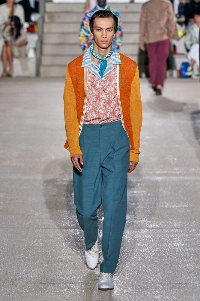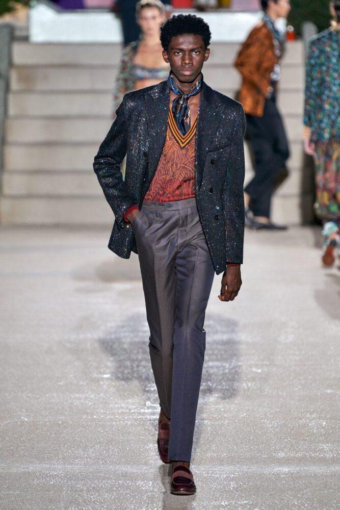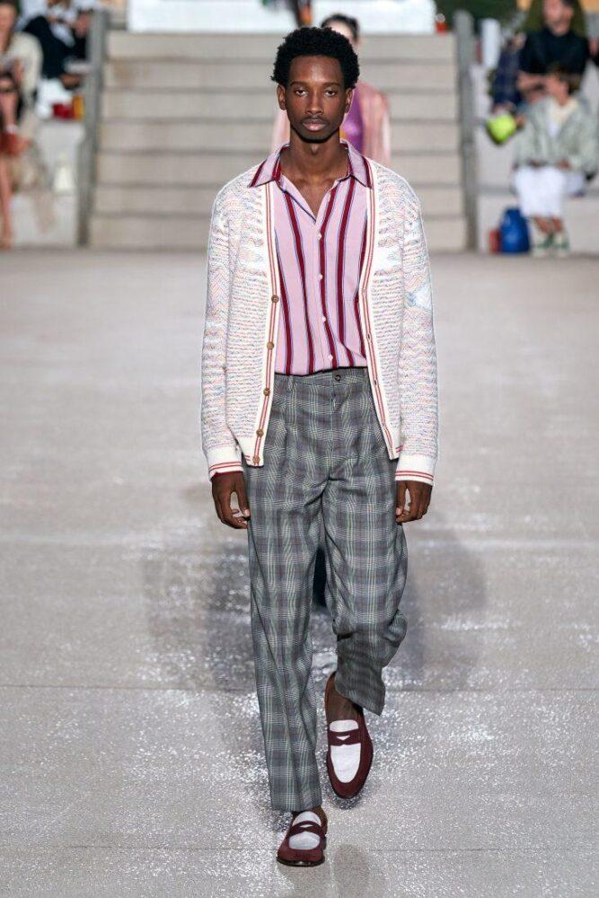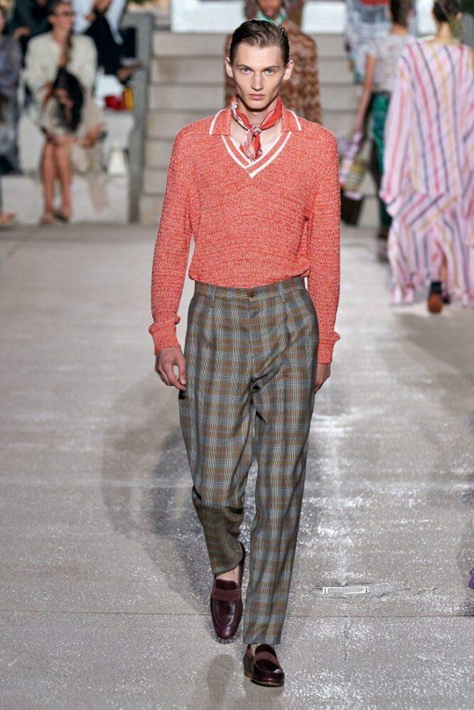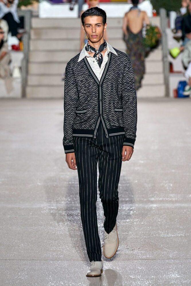 Missoni предлагает мужчинам носить в 2020 г. цветной вязаный жилет с V-образным вырезом под пиджак или заменить последний стильным кардиганом, например, модного в предстоящем сезоне меланжевого окраса. Подобный образ можно дополнить шейным шелковым платком.