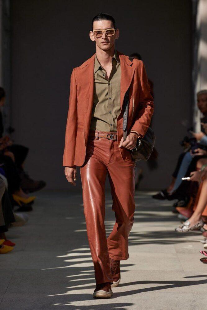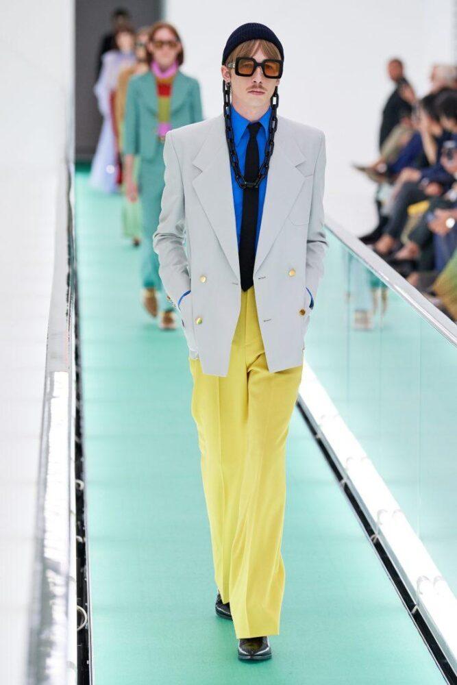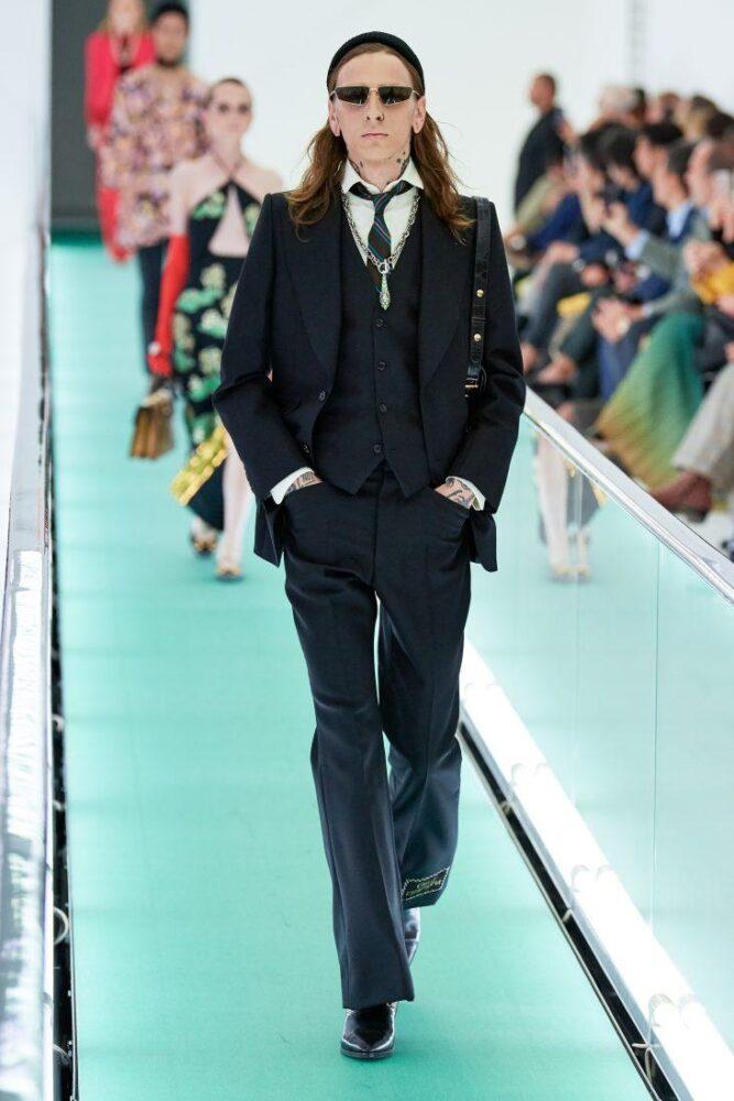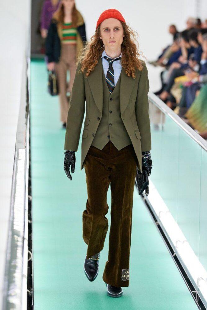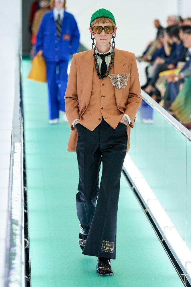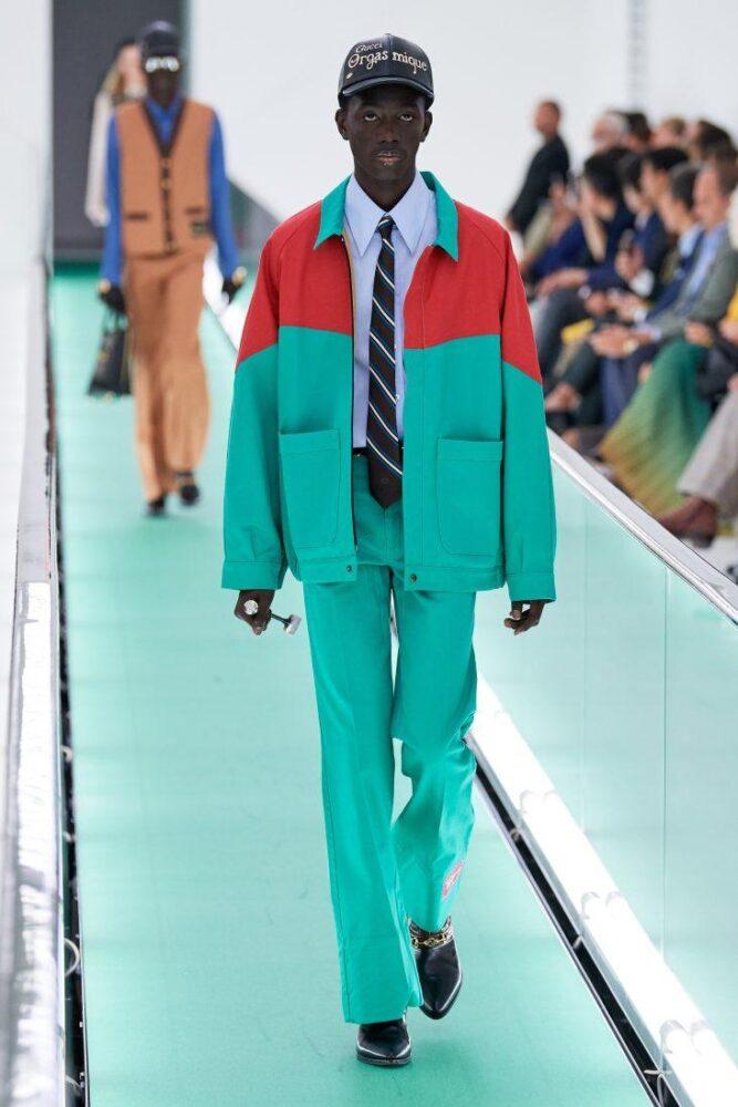 Модный дом противопоставил минималистичному свободному крою кэжуала яркий камбэк к ретро-стилю с приталенными пиджаками и клешем. Также Gucci поэкспериментировал с эклектикой, надев под спецовочный костюм галстук с рубашкой.
