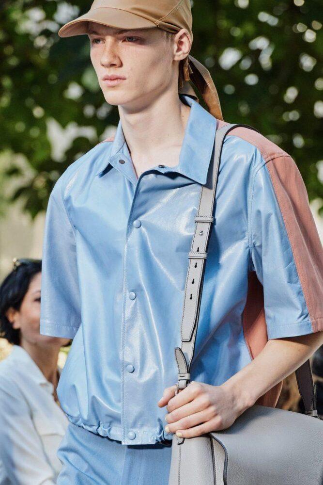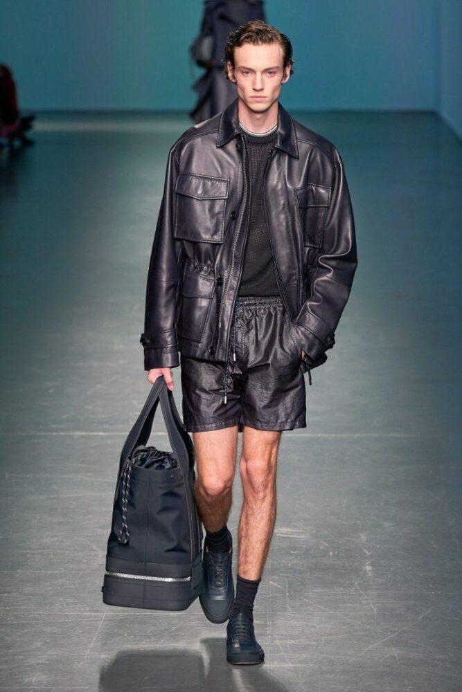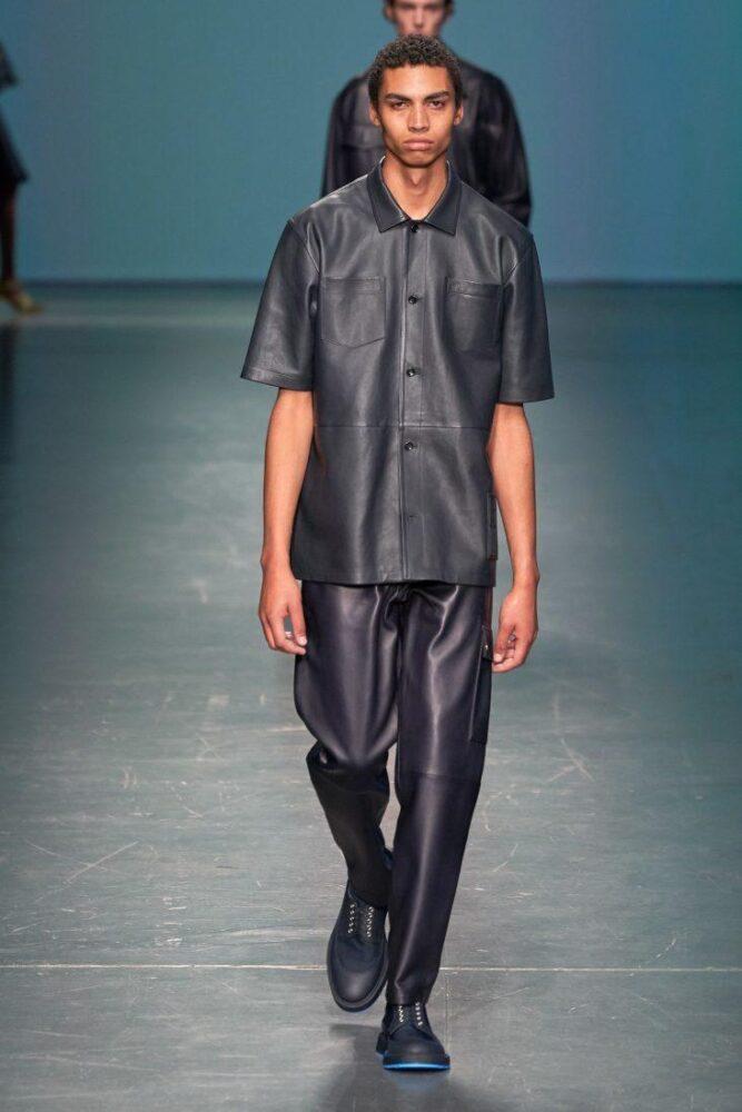 Увлечение дизайнеров кожей не ограничилось традиционными плащами и куртками. В ход пошли кожаные штаны, шорты и даже рубашки с коротким рукавом.