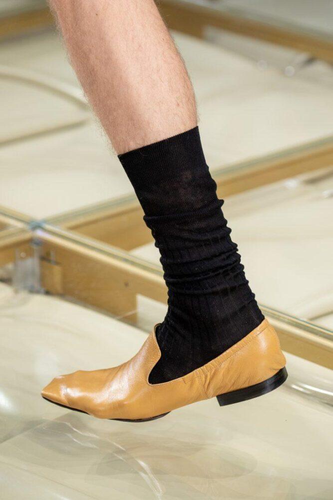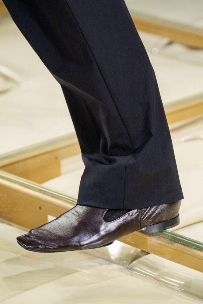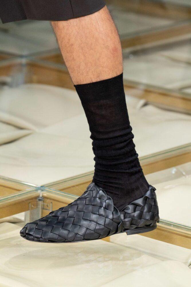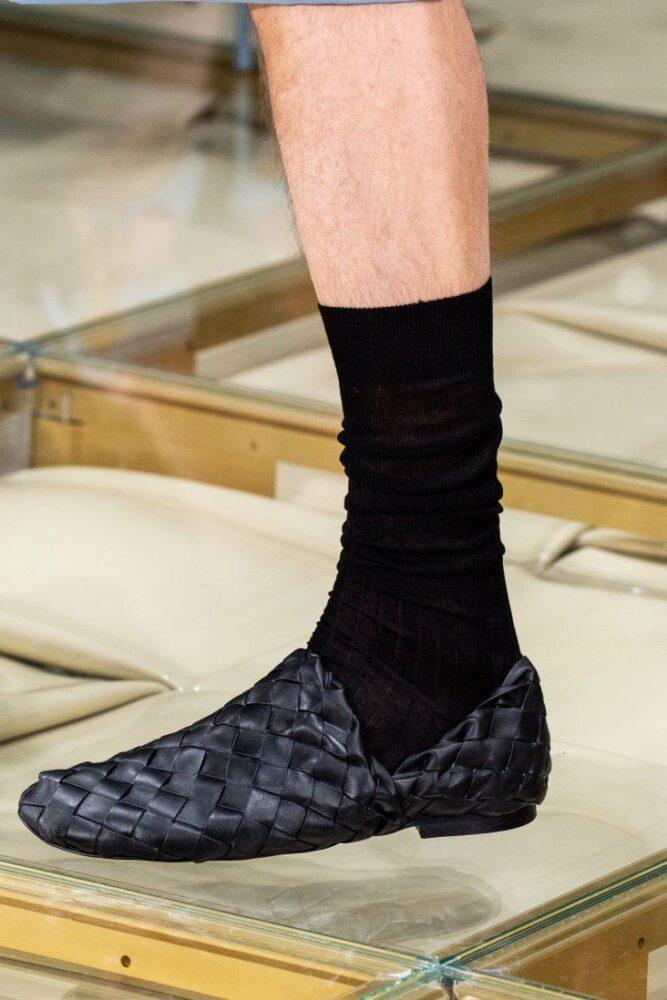 Так, кожаные мужские туфли с квадратным мысом, в т. ч. из плетеной кожи (а-ля лапти), презентовал на неделе моды в Милане Дом Bottega Veneta.
