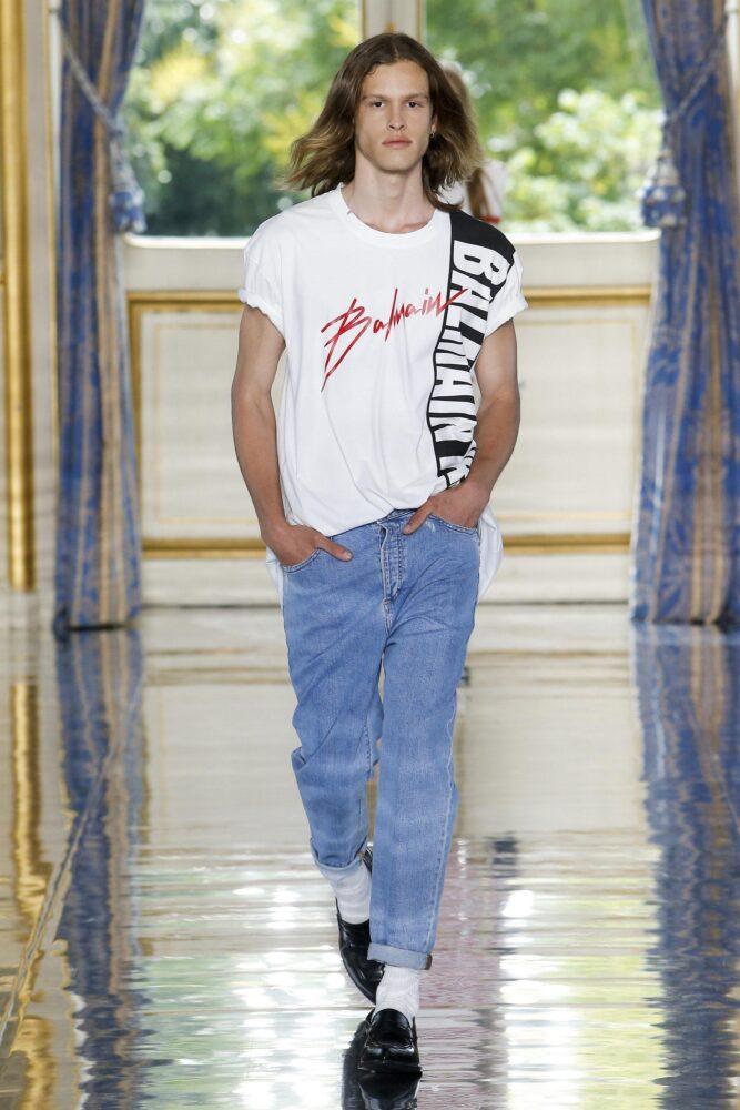 Топовым трендом французской марки стала чёрно-белая полоска. Её встречаем в отделке брюк, удлинённых пиджаков, объёмных регланов. Подобный принт визуально вытягивает силуэт. Серия весна — лето 2019 также обратила внимание на деним. Джинсы – универсальное решение для любого повседневного лука. Стоит отметить оригинальные футболки с названием модного дома.