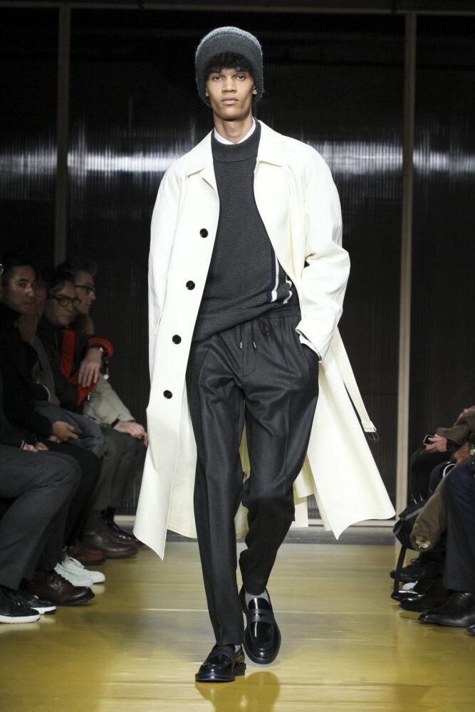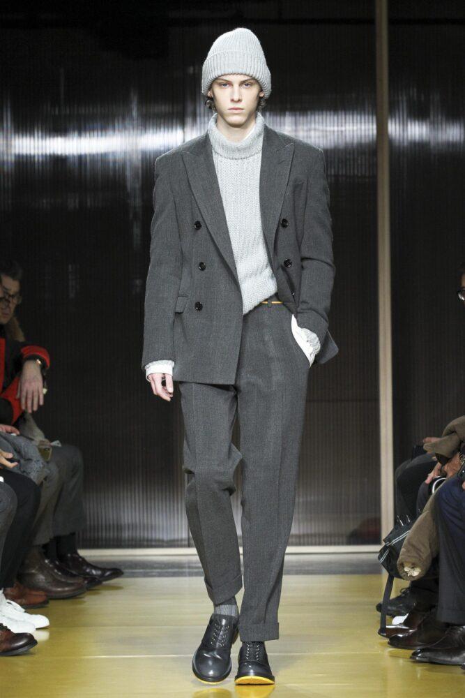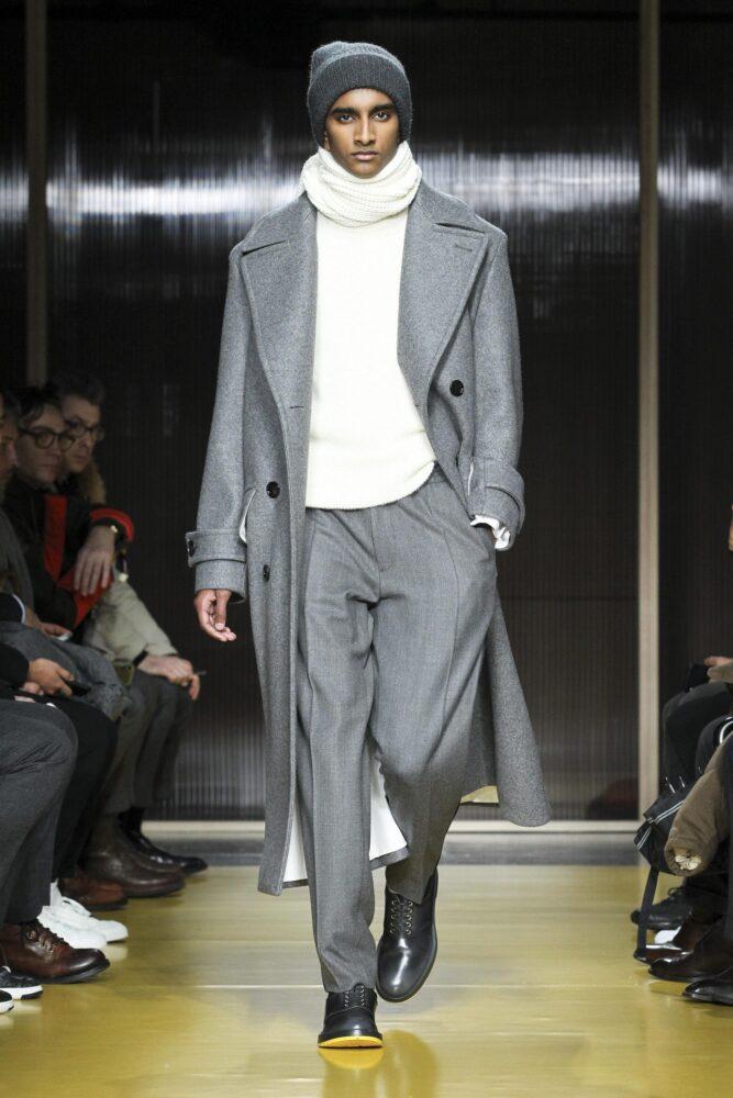 Элегантные луки выделяются интересными комбинациями текстур и фасонов. В тренде плащи и пальто до колена, которые станут ярким акцентом имиджа. Изделия оформлены в коричневом, сером, белом и жёлтом цветах. Блейзеры, кардиганы или свитера с объёмным воротом дополняют брюки классического кроя.