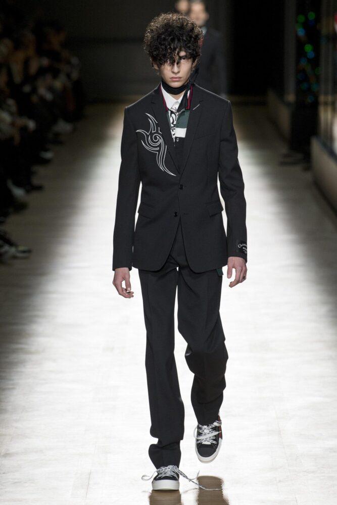 Каждый лук представляет собой точную, завершенную композицию. Длинные строгие пальто дополняет роскошный меховой ворот или стильная вышивка. В брючных изделиях популярны клеш и высокая посадка. Богатая палитра тонов мужской коллекции: от черного до глубокого бордового. Осень—зима 2019—2020 в понимании французского бренда создана для смелых комбинаций.