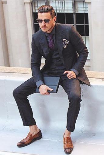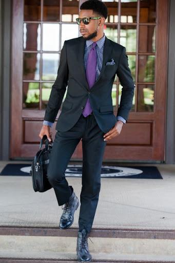 - Фиолетовая подойдет к таким цветам пиджака: черный, серый, синий и голубой.